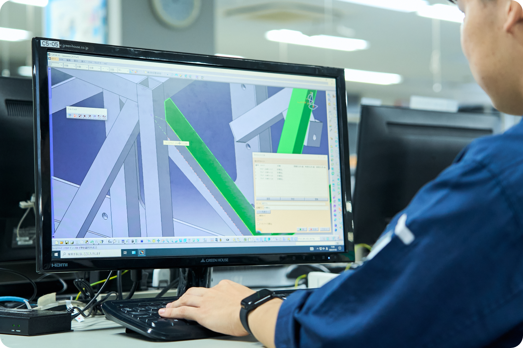製品の受注が決まったら、製品の図面を作成していきます。法や規定で定められている要件を考慮するだけでなく、隣接する製品の形状に合わせて設計していきます。自動車メーカーに直接常駐し、製品設計を行うこともあります。
